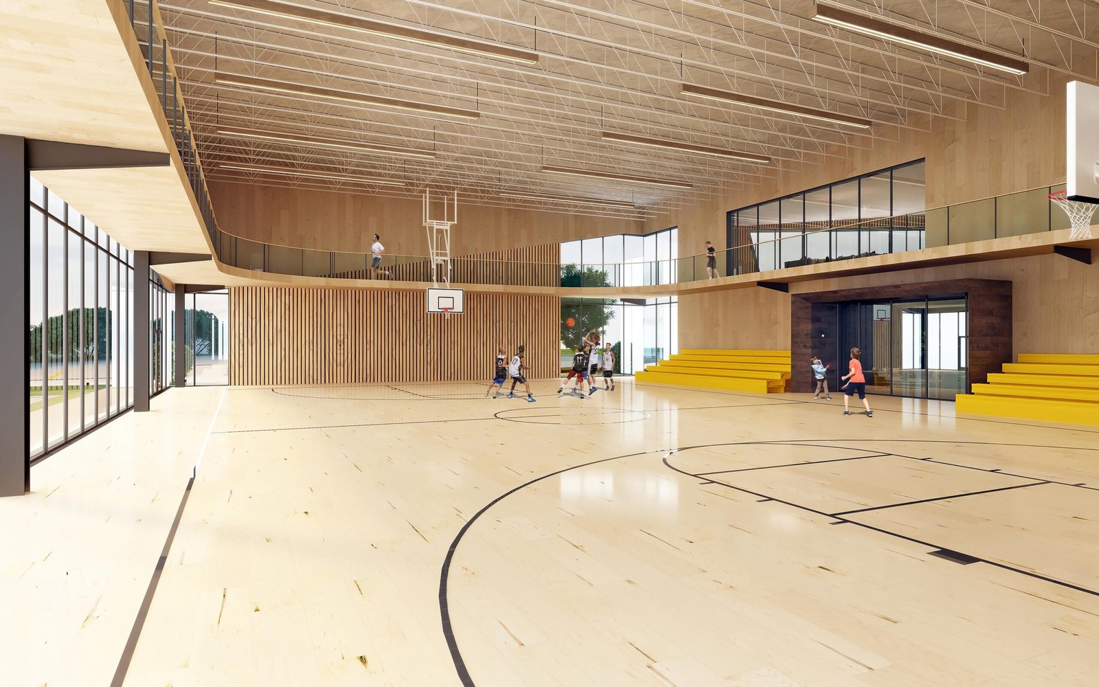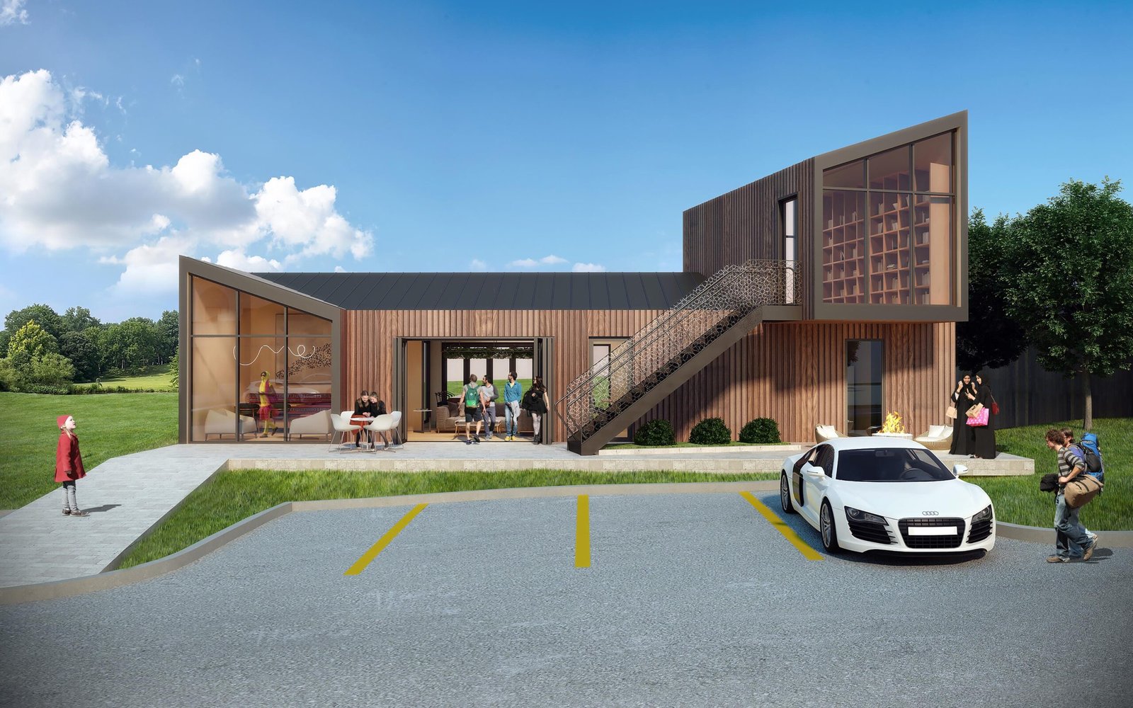 The eastern end of Long Island has a rich history of architect designed beach houses. Located off renowned Dune Road, where most houses are many times its size, the site, known as a flag lot, is one of the last remaining of its kind, in that it is right on the ocean, riding the crest of the dune. Due to the constraints of the allowable building area, the house is located past the current allowable building line and replaces a dilapidated beach bungalow which was falling apart due to the crashing waves. The house is on a long, thin barrier island, connected back to mainland by bridges, allowing it to have views south to the immediacy of the ocean and north to the bay and marshland beyond. The client is a young family living in large apartment in downtown Manhattan. They arrive by car down a long drive and up an entry ramp over the natural dune landscape to a house that is rather small compared to their apartment. It is the opposite of most who have small apartments in the city and larger second homes to get away. Utilizing every available amount of square footage, and sited in the only location allowed by zoning, this compact 2200 sf, two story double wide typology home contains 4 bedrooms and a small office. Sitting atop a dune that was required to be rebuilt prior to construction, the main level communal space with its wall of floor to ceiling glass has the effect of sitting on the beach while within the house, but with access to all the comforts of home. Atop the second level, which contains three bedrooms and a bunk room, interior stairs lead to roof deck with a fireplace, hot tub, space for morning yoga, and commanding views up and down the beach and over surrounding houses.